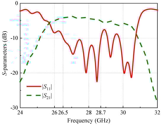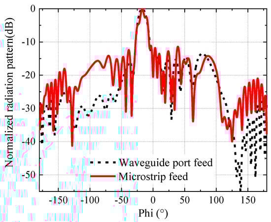 Figure 16 illustrates the S parameters of the arced LWA fed by the tapered microstrip line. It can be seen that the impedance performance was good at 28 GHz. Figure 17 displays the radiation patterns fed by a perfect waveguide port and by the tapered microstrip line. It is clear that the beam direction remained the same for both of the two feedings, which indicates that the arced LWA in this feeding structure can achieve good impedance and radiation characteristics. Furthermore, radiation efficiency of around 45.7% can be achieved by the tapered microstrip-line-fed LWA.