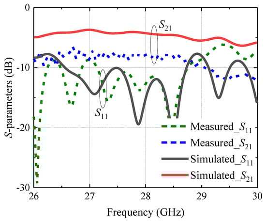 Comparison of S parameters between simulation and measurement results.