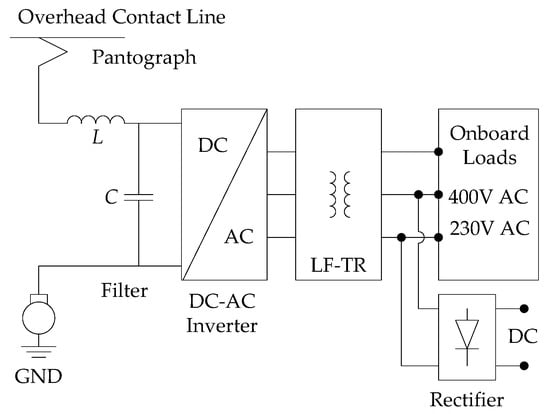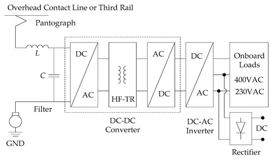 Different APS systems have been proposed for dc trains [9,10,11,12,13,14,15,16,17,18,19,20,21,22,23,24]. The input voltage of the APS system received from the overhead contact line or third rail system typically is between 600–3000 VDC [25]. The output voltages of the APS system are three-phase AC, single-phase AC, and 110 VDC or 24 VDC. The three-phase output voltages of the APS system are either constant-voltage–constant-frequency (CVCF) at 400 VAC 50 Hz/60 Hz or variable-voltage–variable-frequency (VVVF) at 0–400 VAC 0–50 Hz/0–60 Hz, depending on the specifications of the onboard electric loads.