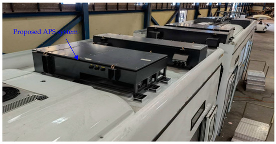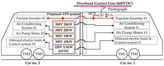 Figure 6 shows the connecting diagram of the proposed APS system and onboard electric loads between cars no. 1 and 2. The pantograph, lightning arrester (LA), main circuit breaker (MCB), traction inverter #1, and air conditioning system #1 are installed on the rooftop of car no. 1. Traction inverter #2, air conditioning system #2, and the proposed APS system are mounted on the rooftop of car no. 2.