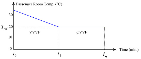 Figure 7 shows the control method of the passenger room temperature of the low-floor LRV. The air conditioning system is turned on at , and the compressor motors start functioning to full load (400 VAC 50 Hz) at the rated speed (1500 rpm). The passenger room temperature continues to decrease until reaching the reference temperature () at . The speed of the compressor motors is reduced to maintain the passenger room temperature at (20 °C) until the end of train operation at .