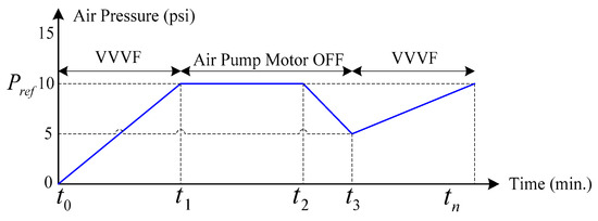 Figure 8 shows the control method of air pressure in the air supply system of the low-floor LRV. The air pump motors are turned on at and the motors start functioning to full load (400 VAC 50 Hz) at the rated speed (1500 rpm). The air pressure continues to increase until reaching the reference pressure () at . The air pump motors stop functioning (from to ) and restart when the air pressure drops below 5 psi to maintain the air pressure at (10 psi) until the end of train operation at .