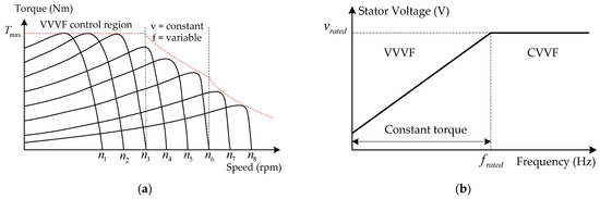 Relationship between torque and speed of the VVVF control method of the compressor and air pump motors: (a) torque and speed; (b) stator voltage and frequency.