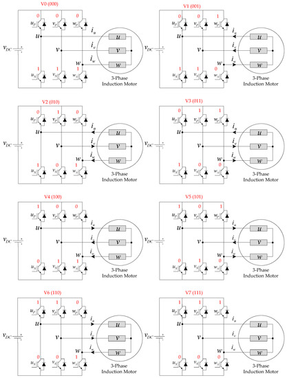 Topology of three-phase two-level dc–ac inverter, the direction of phase currents (, , ), and IGBT switches’ status in voltage vectors ( -).