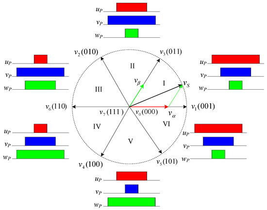 Figure 11 shows eight possible switching vectors for the dc–ac inverters from to with six active switching vectors (–) and two zero vectors ( and ). The voltage vector () in sectors I, II, III, IV, V, and VI rotate from 0°–60°, 61°–120°, 121°–180°, 181°–240°, 241°–300°, and 301°–360°, respectively. Figure 11 also shows the status of upper IGBT switches , , and for the three legs (, , ) using SVPWM. The statuses of the lower IGBT switches , , and are the opposite of those of the upper IGBT switches.