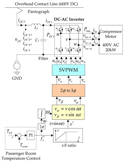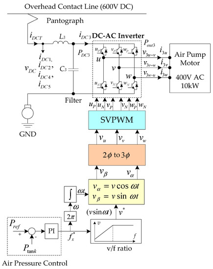 In this research, the three-phase dc–ac inverters are used to convert the 600 VDC received from the overhead contact line to the voltage and frequency for the onboard electric loads, including the air conditioning compressor motors and the air pump motors.