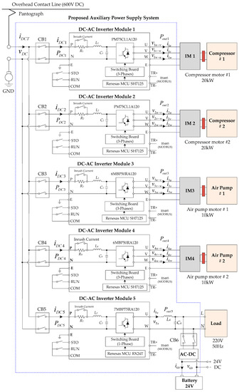 In Table 2, the onboard electric loads consist of two air conditioning systems, which require 3-phase 400 VAC 50 Hz electrical power to operate the compressor motors; two air pump systems, which require 3-phase 400 VAC 50 Hz electric power to operate the air pump motors; and other electric loads including fans, lightings, electric doors, and the battery charging system which require 220 VAC 50 Hz. Due to the demand for VVVF and CVCF for onboard electric loads, this research thus proposes an APS system using five parallel-connected dc–ac inverters that supply both VVVF and CVCF outputs for the onboard electric loads of the low-floor LRV. For safety reasons, the high-voltage side of the proposed APS system, the grounding system of the 600 VDC overhead contact line system, the car body, and the bogies of the low-floor LRV are isolated by onboard air suspensions and insulators.