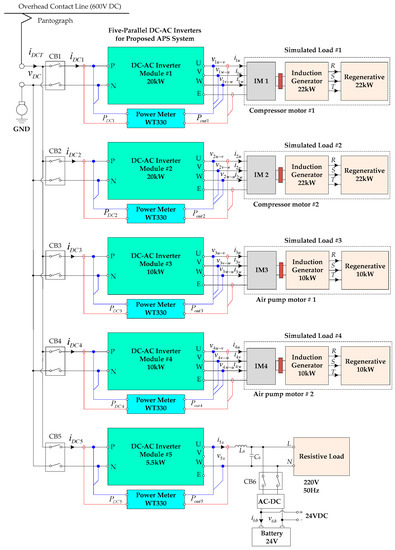 This research proposes a roof-mounted APS system for 600 VDC low-floor LRVs. The proposed APS system consists of five parallel-connected inverter modules (modules 1–5). Inverter modules 1 and 2 are the three-phase dc–ac inverters for the compressor motors of the air conditioning system, and modules 3 and 4 are the three-phase dc–ac inverters for the air pump motors of the air supply system. Inverter module 5 is the single-phase dc–ac inverter for the 220 VAC power supply for onboard electric loads, including lighting, fans, electric doors, and the 24 VDC battery charging system. The v/f control method is used to vary the speed of the three-phase compressor motors of the air conditioning system (modules 1 and 2) and the three-phase air pump motors of the air supply system (modules 3 and 4). The magnitude control is applied to module 5 for 220 VAC output voltage and 50 Hz output frequency. Simulations and experiments are carried out under variable load torques (25–100%) and output frequencies (10–50 Hz) for modules 1–4; and under full resistive load and no resistive load for inverter module 5. The measured total input current () and total input power () of the proposed APS system under the full-load condition are 114.36 A and 68.84 kW, respectively. The total efficiency of the proposed APS system (modules 1–5) is 97.05%. The experimental results indicate that the proposed APS system is suitable for the 600 VDC low-floor RLV. Future research could focus on the design and development of the electric traction system of the 600 VDC low-floor LRV. The total input power of the proposed APS system (in this research) and the electric traction system (in the future research) is further used to design and develop the traction substations of the low-floor LRV.