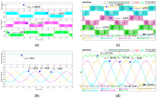 The waveforms of the three-phase dc–ac inverter for the air pump motors (modules 3 and 4): (a) simulated , , , and ; (b) simulated , , , and ; (c) measured , , , and ; (d) measured , , , and ; given that = 600 V, = 50 Hz, and load torque = 75%.