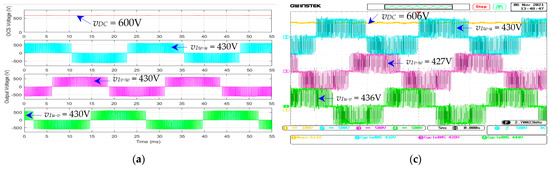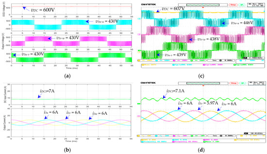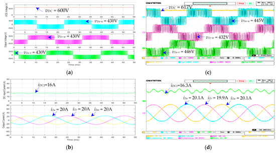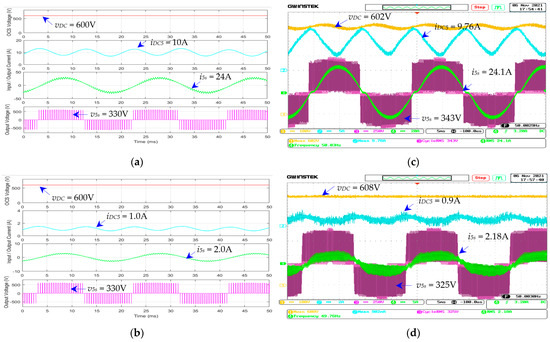Figure 32a,b show the simulated and measured , , , and waveforms of the dc–ac inverter for the single-phase power supply (module 5) under the full-load condition (resistive load = 100%), given that = 600 V and = 50 Hz. Figure 32c,d show the corresponding , , , and waveforms of module 5 under the no-load condition (resistive load = 0%). Under the full-load condition (Figure 32a,b), the simulated , , , and are 600 V, 10 A, 330 V, and 24 A; and the measured , , , and are 602 V, 9.76 A, 329 V, and 24.10 A. The simulated and measured input powers (PDC5) of the dc–ac inverter for the 220 VAC single-phase power supply at full load are 6.0 kW and 5.87 kW. Under the no-load condition (Figure 32c,d), the simulated , , , and are 600 V, 1.0 A, 330 V, and 2.0 A; and the measured , , , and are 608 V, 0.9 A, 325 V, and 2.18 A. The simulated and measured input powers () of the dc–ac inverter for the 220 VAC single-phase power supply at full load are 0.6 kW and 0.58 kW.