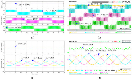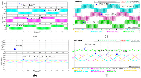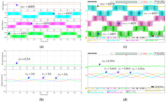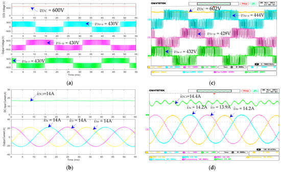 The waveforms of the three-phase dc–ac inverter for the air pump motors (modules 3 and 4): (a) simulated , , , and ; (b) simulated , , , and ; (c) measured , , , and ; (d) measured , , , and ; given that = 600 V, = 50 Hz, and load torque = 50%.