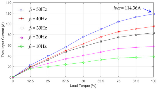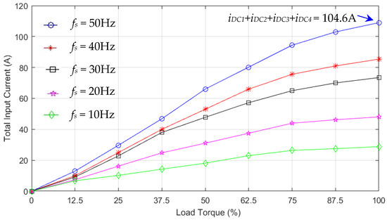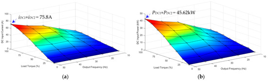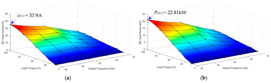 Figure 30a shows the measured dc input current () of the three-phase dc–ac inverter of the air pump motor (module 3) under variable load torques (25–100%) and output frequencies (10–50 Hz). The maximum dc input current () is 14.4 A, given the load torque of 100% (full load) and output frequency of 50 Hz.