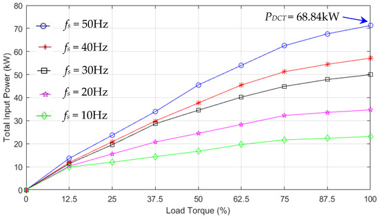 Figure 30 b shows the measured dc input power () of the three-phase dc–ac inverter of the air pump motor (module 3) under variable load torques (25–100%) and output frequencies (10–50 Hz). The maximum dc input power () is 8.67 kW, given the load torque of 100% (full load) and output frequency of 50 Hz.