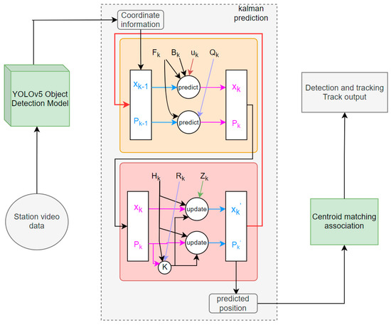 Due to the continuous output of detected objects by the YOLOv5 detection algorithm, we need only the entry and exit timestamps of the objects and their motion trajectories during the detection process. Therefore, we improve the centroid-matching tracking algorithm based on the YOLOv5 detection algorithm. We utilize Kalman filtering to predict the detection results from the previous frame and employ the centroid-tracking algorithm for object matching. This allows us to obtain the motion trajectories and entry/exit timestamps of interfering objects within the seismic station area, enabling target tracking in complex backgrounds. The specific workflow is illustrated in Figure 4: