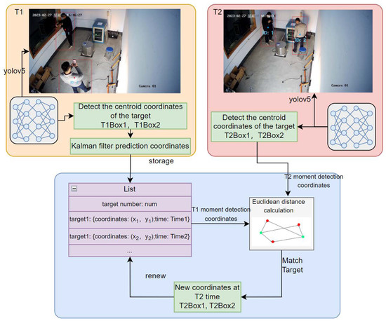 According to Figure 7, at time T1, we need to receive bounding boxes and calculate centroids. To find a bounding box and calculate the centroid for a particular frame, obtaining the centroid coordinates (x, y), we then record the current number of detected targets. We use the Kalman filter algorithm to predict the targets’ positions and store the predicted information in a global list. For subsequent frames, such as T2 in the video stream, we similarly obtain the centroid coordinates at T2 and retrieve the information stored in the list from T1. We establish a connection between the new and old targets by calculating the Euclidean distance between the predicted coordinates at T1 and the detected coordinates at T2. Finally, we update the centroid coordinates of the latest target in the tracking list.
