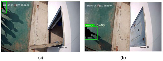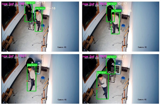 To verify the effectiveness of tracking interfering personnel, this study randomly set multiple individuals to walk around in seismic stations. The tracking was tested under scenarios involving target occlusion and target loss. The occlusion of targets is illustrated in Figure 10: