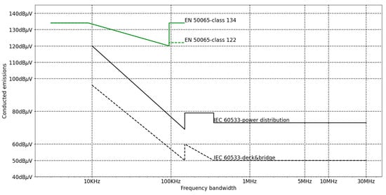 It should be mentioned that the above proposals are compatible with the current state of art but also does not exclude new techniques to improve EMC performance of switched converters. For example, the spread spectrum technology can reduce the peak envelope of a peak and average EMI sweep, which allows designers to choose a smaller-size and less expensive EMI filter []. Moreover, following more investigations on EMC for DC microgrids, the proposed chimney-like emission limits could be further refined and adjusted, like constructing more portions of frequency bands.