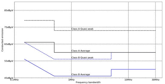 To solve EMC-related issues in DC microgrids, electromagnetic emission limits and survivability of electrical and electronic equipment should be specified. There are already mature EMC standards for AC applications. For example, CISPR 32 specifies the limits in conducted emissions for industrial loads (class A) and residential loads (class B), from 0.15 MHz to 30 MHz []. In DC microgrids, similar standards are often missing.
