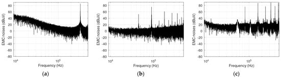 Electromagnetic noise of three test cases is shown in Figure 3. It is seen that there is an amount of noise below 500 kHz. Noise emissions may differ depending on the switching frequencies of DC/DC converters.