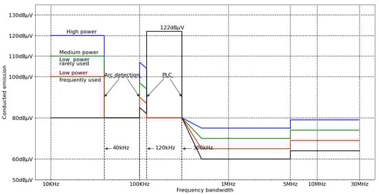 In order to interface a multitude of electrical devices in a complex topology DC microgrid and to avoid EMI with PLC and arc hazard detection, it is proposed to introduce new conducted emission limits and reserve particular bands for PLC and arc detection. Reviewed EMC requirements are proposed hereafter depending on the characteristics of individual devices, which is shown in Figure 4, wherein: