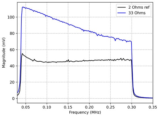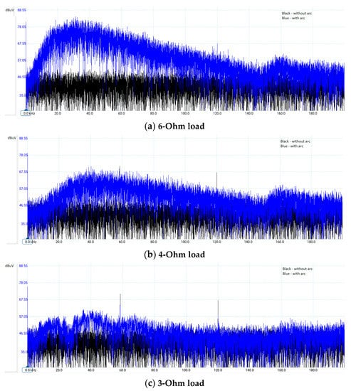 Arc noise is analyzed by the FFT functionality of Pico Scope. The Hamming window is selected. The detection results are shown in Figure 12. It is seen that when the load impedance reduces, the measured arc noise also becomes smaller. In case c, the arc noise overlaps with background noise which makes arc detection challenging. In addition, it should be said that to some extent, arc occurrence is random. The above tests were repeated several times and the most typical results are presented.