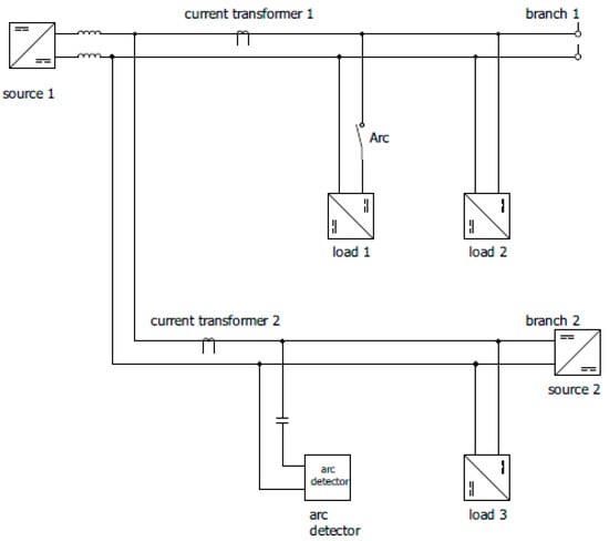 DC arc hazard detection today is commonly applied in photovoltaic systems and an important safety feature. Photovoltaic systems, however, are only a simple case of a DC microgrid with only the PV modules as source and the PV inverter or converter as a load. The detector with disconnector is obviously placed at the PV modules. Arc hazard detection is done based on the cable current measurement and the fine tuning of the detection algorithm is straightforward and based on the properties of the converter and modules. This solution is well known. However, this cannot be easily applied to more complicated DC microgrids with multiple sources and loads. For example, Figure 10 shows an already more complicated DC microgrid with two branches. In a DC microgrid, it is a useful feature that the detector can be in a single location and detect faults wherever in the grid, even when the arc hazard current doesn’t flow through the wires where the detector is located. For example, this is the case in Figure 10 when the arc fault is located at load 1 and directly supplied with source 1 and the detector is based on current transformer 2.
