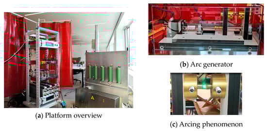 The developed arc detection circuit and method are tested in the platform shown in Figure 11, which includes: a DC power supply, LISN, arc generator and load []. Delta SM500-CP-90 is installed as the DC power supply. Customized LISNs (L-LISN 1-4) are adopted to simulate the impedances of cables connected respectively to the source and the load. A resistor bank is connected as the load.