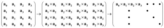 After construction through the above process, the UAVs communicate in each round in accordance with the rules of the constructed Latin square, and the two UAVs corresponding to each round interact with each other to aggregate their authentication information and keys and form a new Latin square. Finally, a consistent key is obtained through this aggregation process. The process of signature aggregation confirms the legitimacy of the aggregated key; each member can verify the legality of the whole process, and any illegitimate user will cause errors in the final aggregated signature. Thus, the Latin square construction process ensures efficient authentication and key negotiation. In accordance with the nature of a Latin square, the aggregated information exchanged between the two communicating parties for each round of authentication and key negotiation does not contain duplicate elements, as shown in Figure 6.