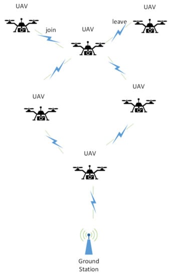 Unmanned aerial vehicles (UAVs) [] are unmanned aircraft that can be flown autonomously or remotely controlled using wireless channels for communication. The benefits of UAVs include their simple structure, flexible deployment, and low prices. In recent years, with the rapid development and large-scale application of internet-of-things (IoT) technology, the development trend of UAVs has shifted from single UAVs to the cooperative operation of multiple UAVs. UAV mobile ad hoc networks (UAVMANETs) [] composed of multiple UAVs have become a new type of mobile self-organized networks that are widely used in commercial drone performances, joint search and rescue operations, environmental surveys, military missions, and other applications.