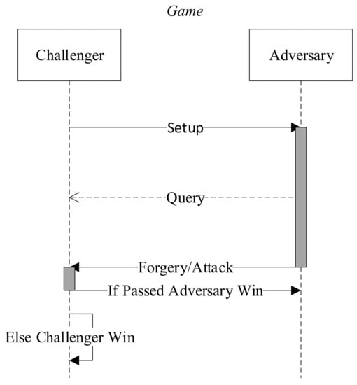 According to the security model introduced earlier, the adversary and the challenger run as follows.