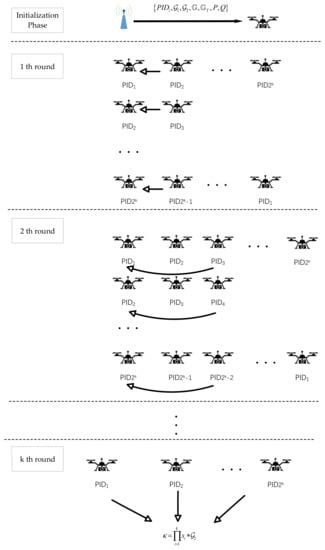 UAVMANETs, as a special kind of ad hoc network, have a multiparty key negotiation problem. Solutions to this problem can be divided into two categories: noninteractive key negotiation protocols and interactive key negotiation protocols. Noninteractive key negotiation protocols allow the communicating parties to negotiate the same key in a single key negotiation. After Diffie and Hellman [] proposed the first noninteractive key negotiation protocol in 1976, many cryptographers attempted to extend this approach to multiple parties, that is, to solve the group key negotiation problem through a single key negotiation. Joux [] first accomplished the expansion of the Diffie–Hellman (DH) protocol from two to three parties with only one round of communication but did not expand the protocol to more than three members. Garg et al. [] proposed implementing a multilinear mapping scheme (the GGH scheme) on an ideal lattice using a hierarchical coding system as a solution to the multiparty key negotiation problem. However, this scheme was proven to be unreliable by Hu et al. []. Therefore, at present, it is not possible to achieve a noninteractive key negotiation protocol with more than three parties. The research on interactive key negotiation protocols is mainly based on expanding the two-party DH protocol to multiple parties [,] by using the DH protocol as the core scheme to form a unified key through the interaction of the protocol participants in multiple communication rounds.