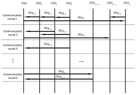 A single member generates a signature message by the member communication rules specified by the Latin square constructed as described in the previous section and then starts the first round of communication. During the communication process, the members participating in each communication round aggregate the signatures from the previous communication round. Eventually, each member can generate a uniform aggregated signature and can verify the signatures from the previous rounds. Based on the difference in the aggregated signatures, the communication round in which an object was sent can be located.