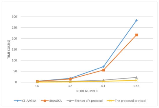 In this comparison, we used the class A elliptic curve in the pypbc library in Python to calculate the time overhead of each protocol for the cases of 16, 32, 64, and 128 group members. The calculated run times of the four protocols are compared in the form of line graphs in Figure 7. With 16 members, the protocol proposed in this paper is 2.5 times faster than the Shen et al. protocol, 5.7 times faster than the IBAAGKA protocol, and 12.8 times faster than the CL-AAGKA protocol. In the case of 128 members, the protocol proposed in this paper is 3.9 times faster than the Shen et al. protocol, 15.5 times faster than the IBAAGKA protocol, and 61.5 times faster than the CL-AAGKA protocol.