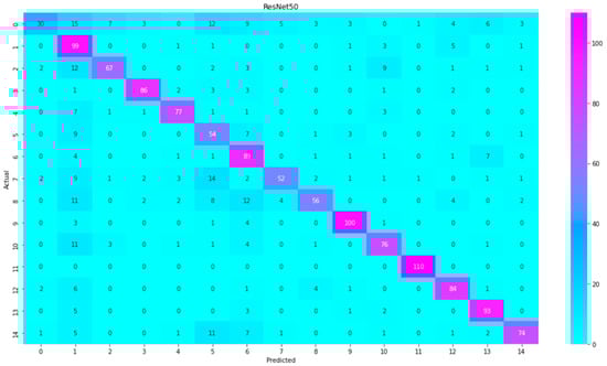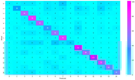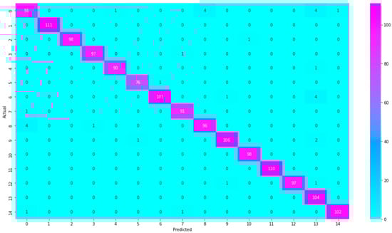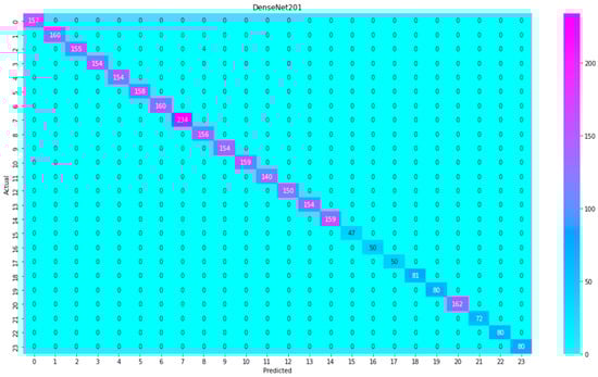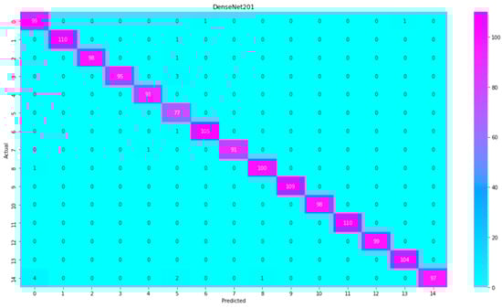 Heatmaps are a valuable visualization tool to evaluate the predictions made by classification models by providing a graphical representation of the concentration of the predicted values for each class. They enhance the interpretability of classification results and provide a visual aid in analyzing the models’ predictions. Heatmaps for the predictions made by DenseNet-201, Xception, MobileNetV3-Small, and ResNet-50 on the test set for Fruits-360 are included in Figure 2, Figure 3, Figure 4, and Figure 5, respectively. The class names corresponding to each class number in the figures are shown in Table 4.