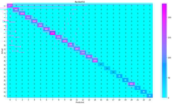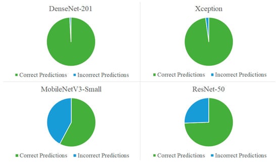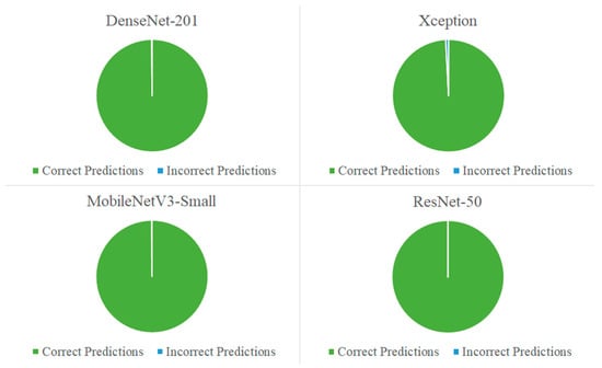 The performance of ResNet-50 was the most remarkable. Not only did it achieve 100% accuracy on the test set but the scores it attained for precision, recall, and f-measure were also perfect, meaning that not even one prediction made by the model was wrong. The results of MobileNetV3-Small closely follow behind with only two incorrect predictions out of the total 3110 predictions made. DenseNet-201 follows with only four incorrect predictions, and Xception comes last with 25 incorrect predictions. The prediction results for each model are summarized in Figure 11.