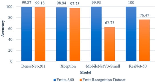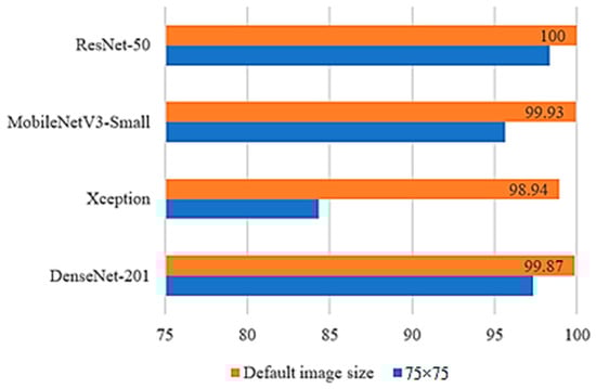 Fruits-360, DenseNet, MobileNetV3, and ResNet were successful in achieving accuracies above 95% on the test set when input images of size 75 × 75 pixels were used. However, the accuracies of all models improved significantly when the input images were resized to the default image size for each model. All the models achieved nearly 99% accuracy or above in this case. The most noteworthy improvement was demonstrated by Xception which increased its accuracy from 84% to 99%. The improvement in accuracies of all models is shown in Figure 10. The highest accuracy was obtained by ResNet for both image sizes, confirming its effectiveness.