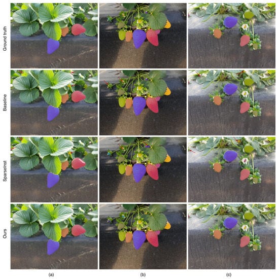 Figure 3 shows visualization comparisons of different methods on some images from the Straw DI_Db1 testing set, wherein we denote the inaccurate predictions by the red arrows. For the first column, the baseline model mistakenly predicts the leaf as the strawberry, which occurs at SparseInst. For the second column, the baseline model and SparseInst miss two and one strawberries, respectively, and SparseInst predicts an inaccurate mask. For the third column, the baseline model and SparseInst mistakenly predict the leaf as the strawberry, and SparseInst misses one strawberry in the corner of the image. The visualization results demonstrate the superiority of our model.