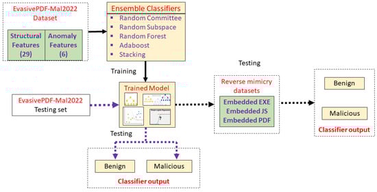 In [29], a system for detecting evasive PDF malware was proposed based on Stacking ensemble learning. The detection system is based on a set of 28 static features which were divided into ‘general’ and ‘structural’ features. Their system was evaluated on the Contagio dataset, yielding an accuracy of 99.89% and F1-score of 99.86%. They also evaluated the system on their newly generated Evasive-PDFmal2022 dataset [27] for which they achieved 98.69% accuracy and a 98.77% F1-score, respectively.