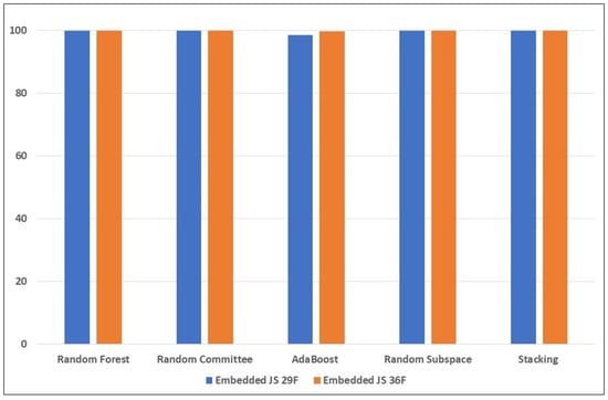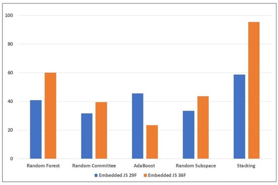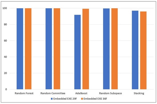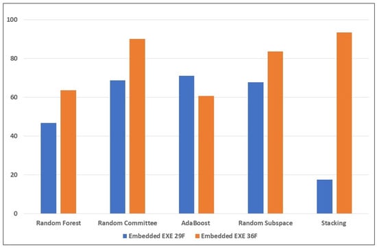 From Table 6 (with the new anomaly-based features), there is significant improvement in the detection of the mimicry attacks. Random Committee and Stacking detected 449 (90.1%) and 466 (93.6%) samples of the embedded EXE attack, respectively. For the embedded JavaScript, Stacking also obtained 477 (95%) detected samples, while for the embedded PDF, the highest was AdaBoost, with 68.9% (344 samples). Again, this highlights how challenging it is to detect the PDF embedding attack, for the reasons mentioned earlier. However, there is improvement compared to the results in the previous table; this can be attributed to the new anomaly-based features introduced into the feature set. The significant improvement in the performance of the Stacking learning model highlights the impact of the anomaly-based features introduced into the mix. The new features mal_trait2, mal_trait3, and mal_traits_all are most likely to be responsible for enhancing the ability of the ensemble learners to detect more embedded EXE samples. The new feature mal_trait2 is likely to have had the most impact in improving the models’ ability to detect embedded PDF samples. Figure 3, Figure 4 and Figure 5 visually depict the percentages of detected samples with and without the new features for each of the three types of reverse mimicry attacks investigated.