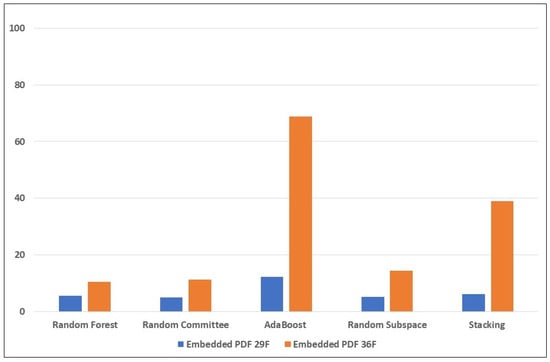 From Table 5 (without the new features), it can be seen that the best result for embedded Exe was AdaBoost, with 71.2%, i.e., 355 samples detected. For the embedded JavaScript, the best was the Stacking model which detected 293 samples (58.8%). In the embedded PDF set, the highest was only 12.2% (61 samples) detected. This shows that the embedded PDF was the most challenging attack to detect. One possible reason for this could be the lack of structural features (keywords) that directly indicate when a PDF file is present in the PDF file. In the feature set there are two keywords directly related to JavaScript, which may make it easier to detect embedded JavaScript attacks. Another possible reason could be the way the embedded PDF attack was crafted. The embedded PDF can be used to nest other features which will not appear within the parent benign PDF, thus tricking the classifier into predicting the sample as benign.