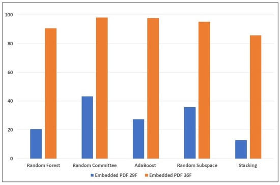 From Table 7, the results of the ensemble learners’ performance when trained without the new features seem to confirm our hypothesis in the case of embedded EXE and embedded JavaScript detection of reverse mimicry attack detection. Random Forest and Random Committee models detected all the samples from both attacks. However, they still performed poorly when tested with the embedded PDF sample set, despite having augmented the training set with 50 samples from the embedded PDF set. Data augmentation of the training set with adversarial examples clearly made the detection of embedded EXE and embedded JavaScript mimicry attacks much easier to detect, even without the new features.