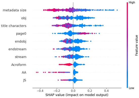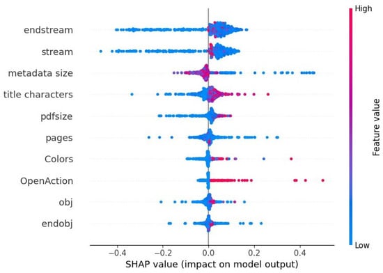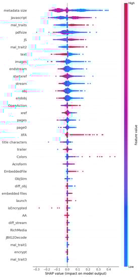 In this section we will explain the ensemble model for evasive malicious PDF detection using SHapely Additive exPlanation (SHAP). SHAP was introduced by Lundberg and Lee in 2017 [36] as a model-agnostic method of explaining machine learning models based on Shapley values taken from game theory. SHAP determines the impact of each feature by calculating the difference between the model’s performance with and without the feature. Thus, it provides an understanding of how much each feature contributes to the prediction. In Figure 9 a SHAP summary chart can be seen from which we can visualize the importance of the features and their impact on predictions. This plot was generated from building an ensemble model with 80% of the dataset and testing on the remaining. The features are sorted in descending order of SHAP value magnitudes over all testing samples. The SHAP values are also used to show the distribution of the impacts each feature has on the prediction. The colour represents the feature value, with red indicating high while blue indicates low.