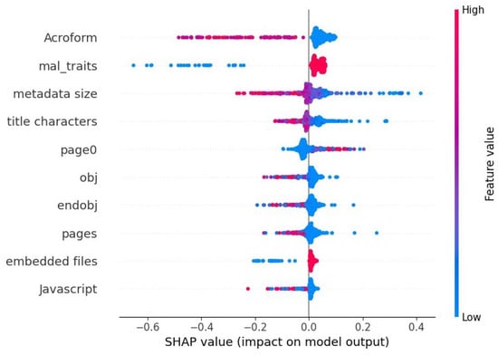 In Figure 10, the SHAP summary chart depicts the impacts of the top 10 features on an ensemble model’s prediction on the embedded exe reverse mimicry test set. It shows the the presence of Acroform (which is indicative of potential manual input into the document) has a negative impact on the prediction (i.e., benign is predicted) while the opposite is true. This also happens when metadata size is large (red) or there is a large number of objects or pages in the PDF document. The presence of mal_traits (i.e., any of the new anomaly features) leads to a positive prediction, and so does the presence of embedded files.