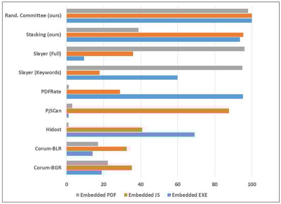 Corum et al. [30] employed visualization techniques for PDF malware detection. The results of their model on the reverse mimicry dataset is shown in Table 9. The best result from that paper was obtained from using Byte plot + Gabor + Random Forest classifier, which detected only 95 out of about 500 samples for EXE embedding; 176 out of 500 for JS embedding; and 111 out of 500 for PDF embedding. In Table 9 and Figure 13 this approach is named as Corum-BGR. Their Byte plot + Local entropy + Random Forest approach detected only 70 out of 500 for EXE embedding; 162 out of 500 for JS embedding; and 85 out of 500 for PDF embedding. In Table 9 and Figure 13 this approach is named as Corum-BLR.