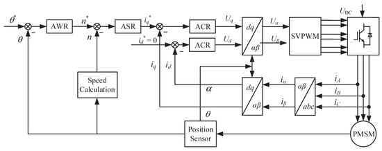 Based on the PMSM model in dq-frame above, the structure for three-closed-loop control of PMSM servo system is displayed in Figure 1. The control strategy is based on space vector pulse width modulation (SVPWM) control with .