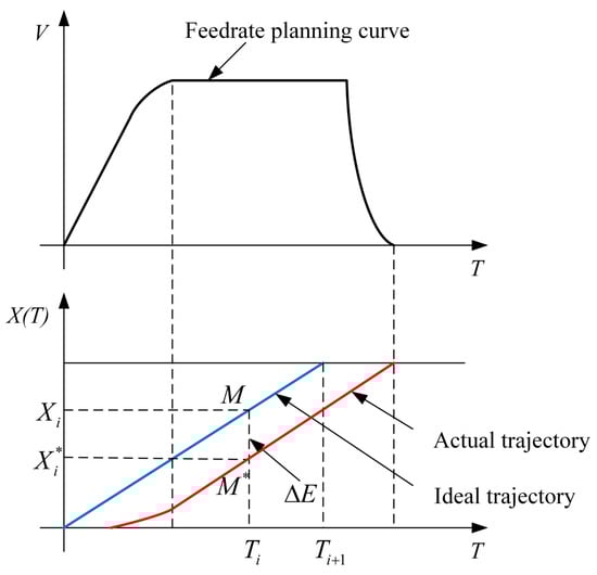 During the machining process, response errors can occur in CNC machines as a result of the response lag inherent in the servo system. For using the sampled-data method, theoretically, there is a ramp signal approximating the ideal curve trajectory through a straight line segment in each interpolation cycle. Figure 4 shows the tracking error by inputting a constant feedrate in an interpolation cycle. As is shown in Figure 4, when the time is , the actual value can track the ideal value at the time of . Therefore, there is always an error E between the actual and the ideal trajectory when the system has reached the given feedrate and entered the steady state.