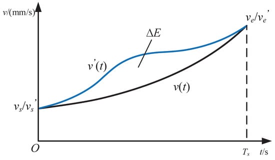 In accordance with the PMSM model and the designed controller, the closed-loop transfer function Equation (5) can be effectively represented as a typical second-order system. In the trajectory interpolation process, the input to the system for each interpolation cycle is a ramp signal , where is the feedrate of the single axis for that cycle. At this point, the ramp response can be derive as Equation (9), and then the error response can be obtained as Equation (10).