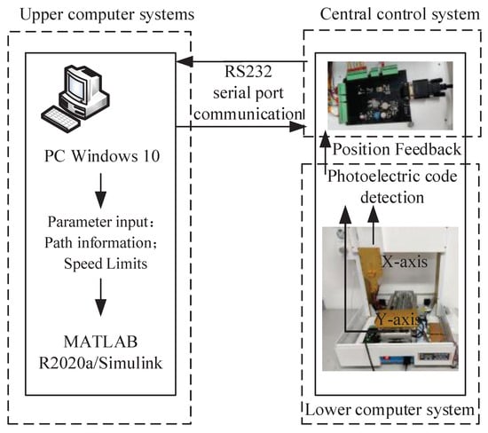 In this section, a CNC platform is built to verify the effectiveness of the error compensation method proposed in this paper. As shown in Figure 11, the CNC platform consists of three main parts: the upper computer unit, the central control unit and the lower computer unit. The upper computer is operated on an Intel(R) Core(TM) i5-8400 CPU @ 2.80 GHz laptop. The central control unit uses the STM32F429 as the core processor and communicates with the upper and the lower computer via RS232 serial communication. The lower computer unit is the PMSM drive system, which controls the parameters of each axis to finish the curve trajectory.