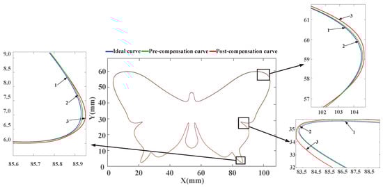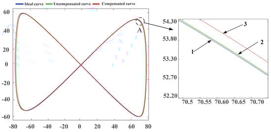 With the proposed error compensation method, the final curve path is displayed in Figure 12. Curve 1 (coloured blue) represents the ideal ‘∞’ NURBS curve, Curve 2 (coloured green) and Curve 3 (coloured red) represents the compensated curve path and uncompensated curve path, respectively. Figure 12 shows that the proposed method achieves a closer alignment between the machining trajectory and the ideal trajectory curve path.