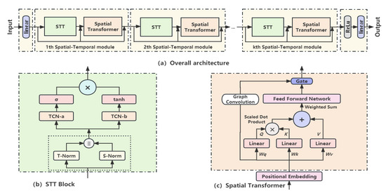 - This study incorporates a transformer into the deep learning model and uses the spatial-transformer module to extract spatial features from the input data. The model connects the spatial-temporal features extracted after k spatial-temporal modules with residuals. The stacked data features are skip-connection through a fully connected layer to finally output the predicted values;
